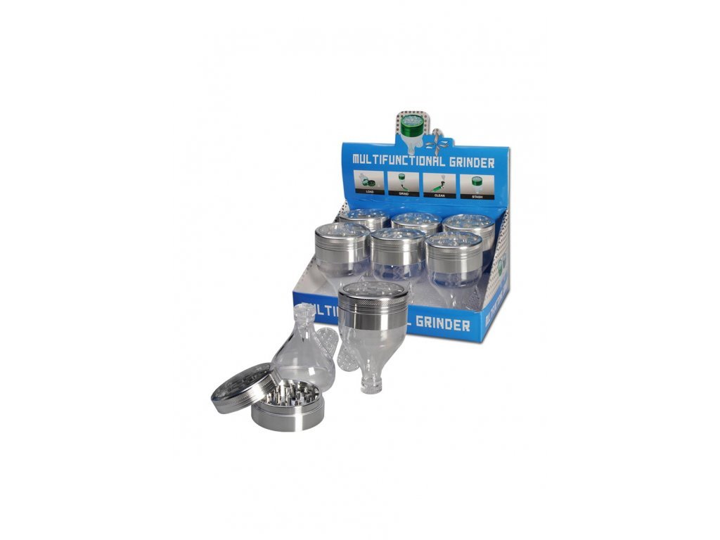 Mlýnek s mnoha možnostmi použití: nejen pro mletí, ale také pro přesné plnění misek díky trychtýřovité spodní komoře. Uzávěr nálevky je zároveň čisticím nástrojem, kterým lze odstranit popel z misky dýmky. Také vyfrézovaný materiál lze prakticky skladovat v samotné nálevce. Multifunkční mlýnek má průhledové okénko v magnetickém víku.