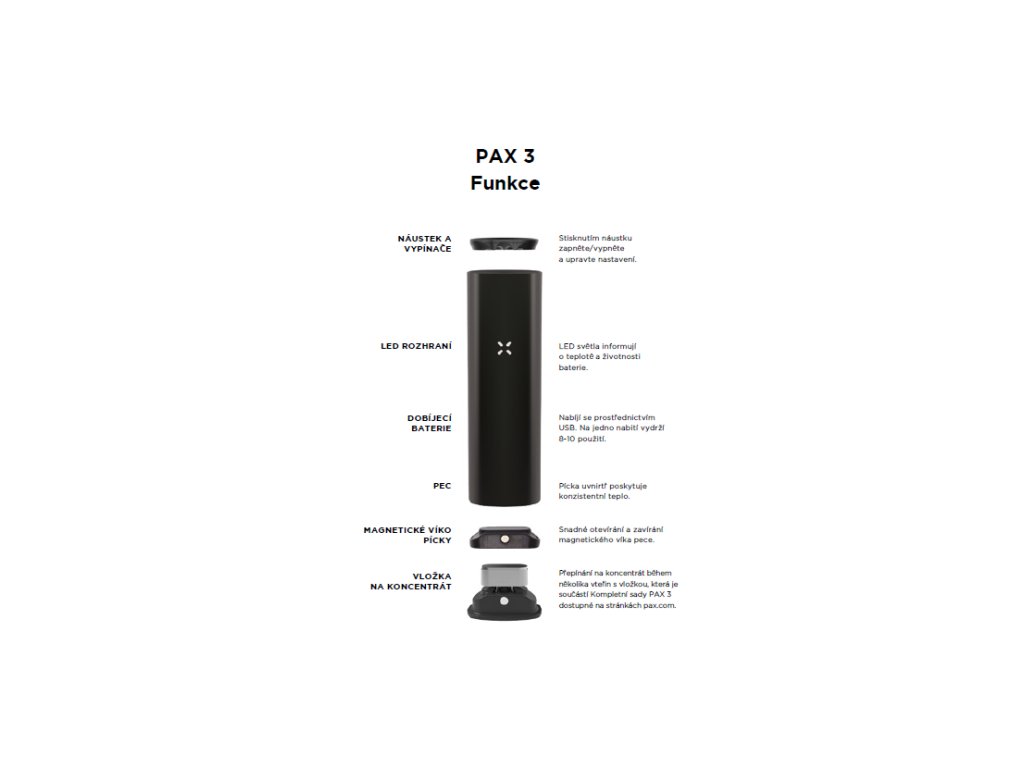 PAX 3 je třetí generace prémiového kapesního vaporizéru na sušené bylinky i extrakty. Špičkový design, kvalita, funkčnost a materiály ve zdravotnické kvalitě - to vše je PAX 3. Umí vše co jeho předchůdce PAX 2 a navíc nabízí větší výdrž baterie, možnost vaporizování extraktů a ovládání pomocí aplikace v chytrém telefonu. Aplikace PAX vapor je k dispozici pro Android i pro iOs. Pomocí aplikace je možné stahovat firmware, ovládat teplotu vaporizace po dvou stupních od 185 °C do 215 °C. Novinkou PAXE 3 je možnost nastavit jeden ze 5 vaporizačních, teplotních programů. PAX 3 sám pozná kdy inhalujete a zajistí automatické sepnutí topného tělesa, a obráceně.